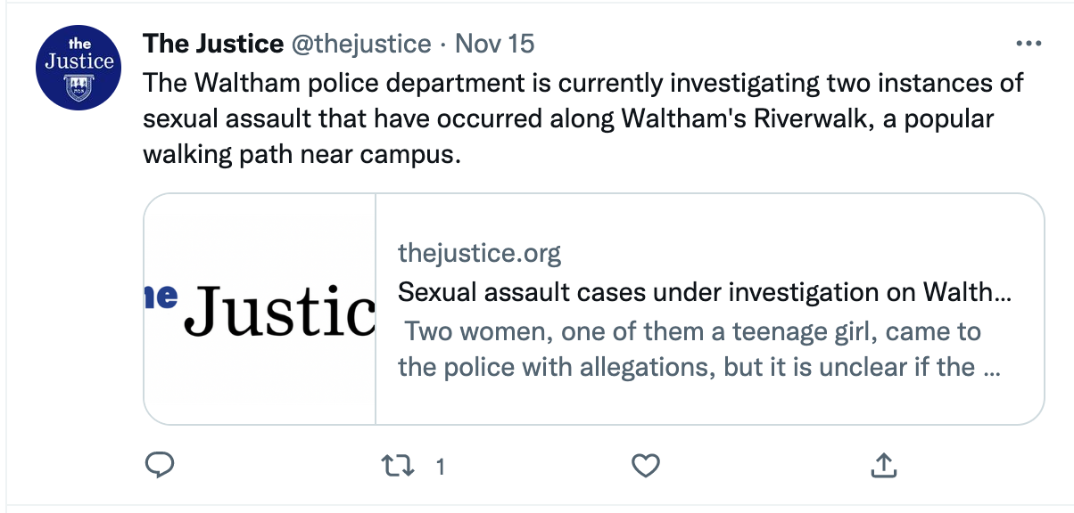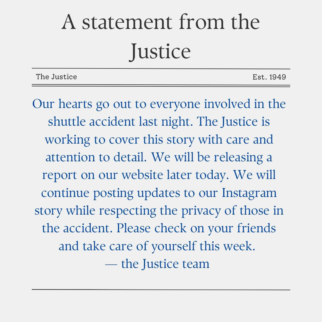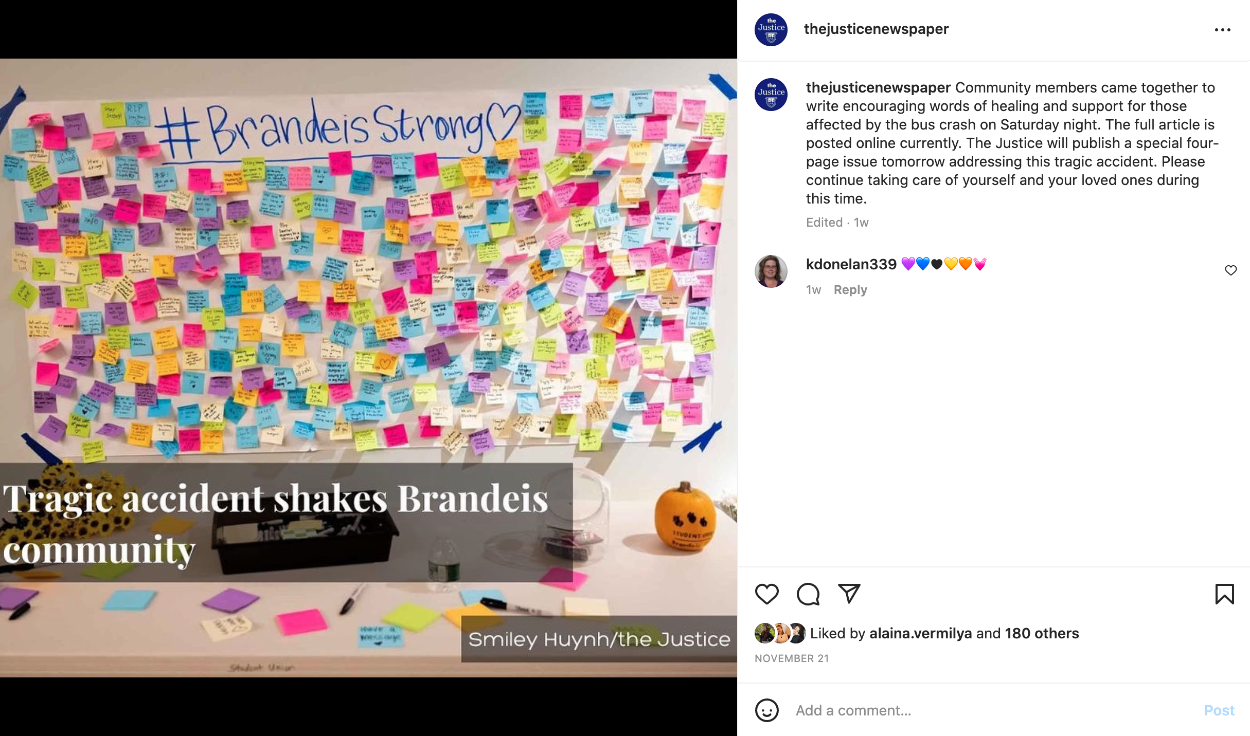 After a tragic Brandeis shuttle bus crash, the Justice social media broke the story starting on Twitter and moving to Instagram. Here, I was required to use my skills in covering breaking news in a timely, yet informative, manner in the world of social media journalism.