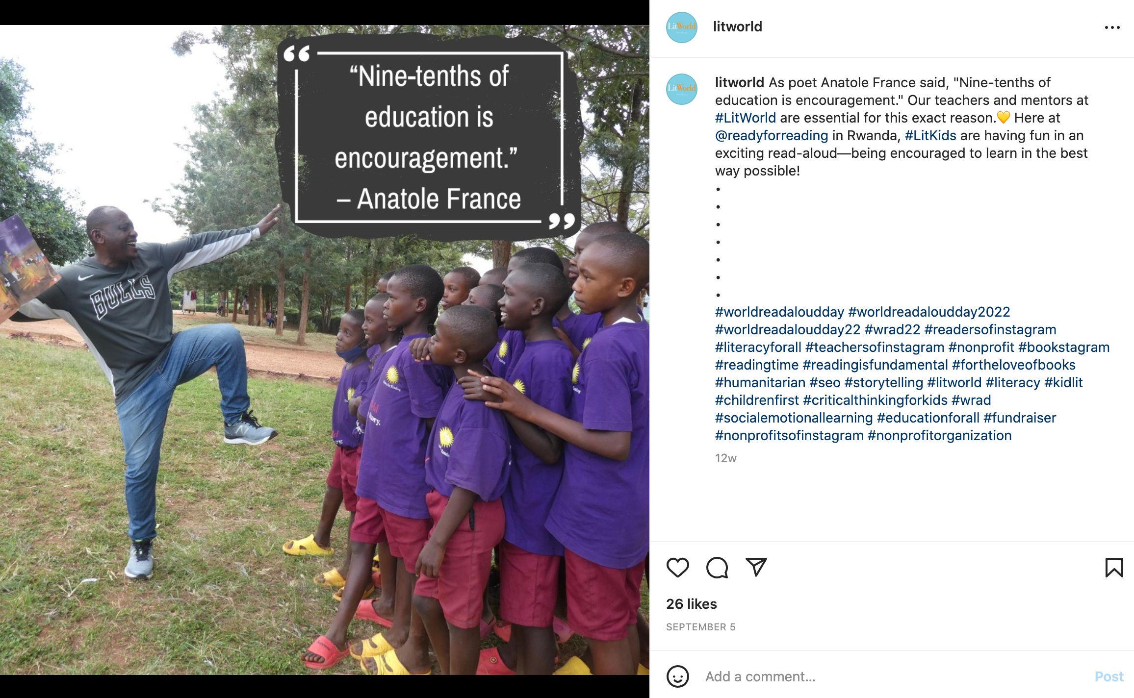 During my internship at LitWorld, I worked with the communications department to manage the social media accounts during Summer 2022 including Facebook, Twitter, and Instagram. I assisted in graphic design and caption writing as well as content planning.
